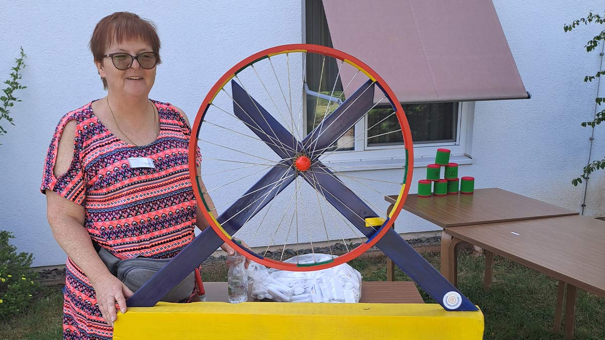 Für Spiel und Spaß war natürlich für Jung und Alt ebenso gesorgt. Ein Glücksrad konnte gedreht werden und Dosen standen zum Bewerfen bereit. So konnten kleine Gewinne abgestaubt werden. Daneben hatte eine Angehörige auch handwerkliche Unikate zum Verkauf ausgestellt. Auch für das leibliche Wohl war bestens gesorgt. Es wurde gegrillt und leckere Salate standen zum Verzehr bereit. Außerdem gab es ein Kaffee- und Kuchenbuffet. Dabei unterstützen die Jugendlichen vom CJD (Christliches Jugenddorf). Herzlichen Dank dafür und natürlich auch an alle anderen, die zum Gelingen des Festes beitrugen.